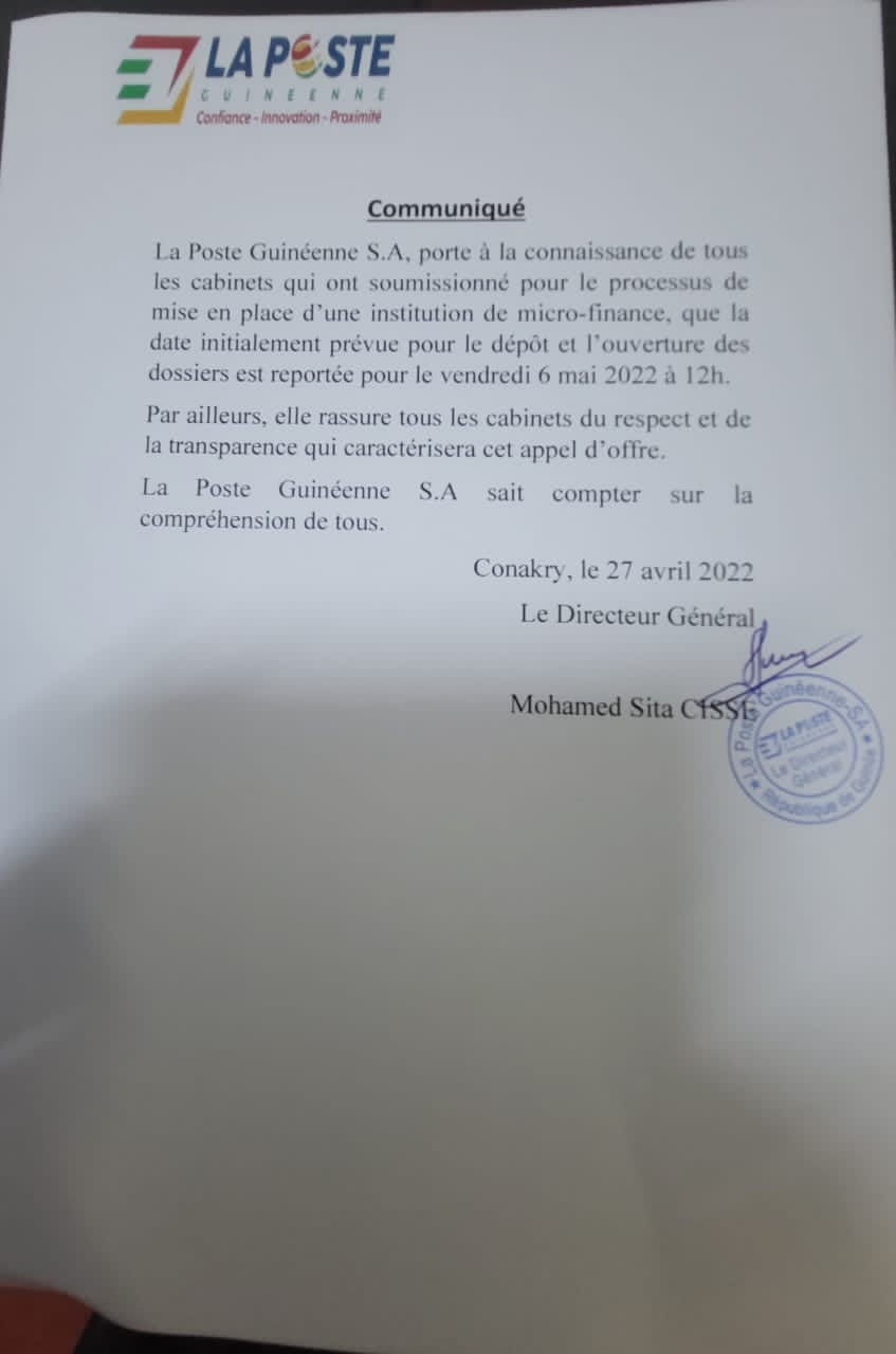 Dans un communiqué en date de ce mercredi, 27 avril 2022 dont Laguinee.info détient copie, La Direction générale de La Poste Guinéenne S.A a porté à la connaissance de tous les cabinets qui ont soumissionné pour le processus de mise en place d’une institution de micro-finance, que la date initialement prévue pour le dépôt et l’ouverture des dossiers est reportée pour le vendredi 06 mai 2022 à midi.