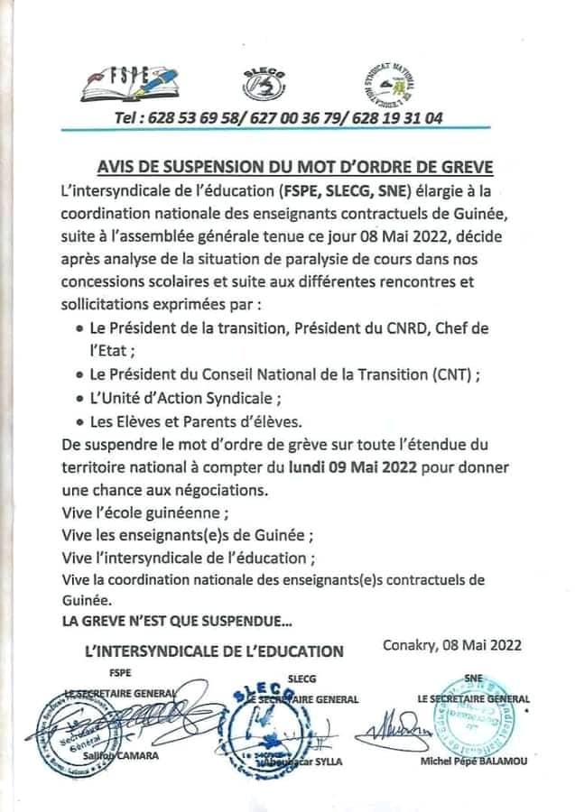 Dans une note en date d’hier dimanche 08 mai 2022 dont Laguinee.info détient copie, l’intersyndicale de l’Education FSPE-SLECG-SNE a décidé de suspendre le mot d’ordre de grève sur toute l’étendue du territoire national à compter du lundi 09 Mai 2022 pour dit-on donner une chance aux négociations.