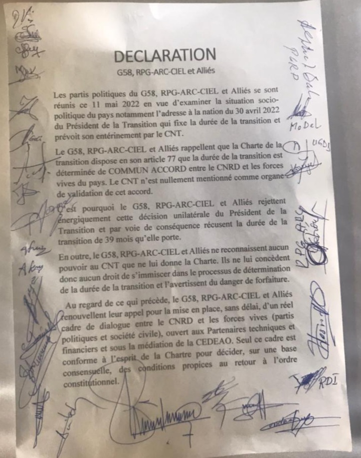 Comme indiqué dans un de nos précédents articles, une rencontre ayant réuni le RPG et alliés ainsi que le G58 s’est tenue ce mercredi, 11 mai 2022 au siège de l’UFDG. L’occasion a été pour ces deux camps politiques d’adopter des positions communes vis-à-vis de la transition. L’une de ces positions est de refuser que le CNT soit l’organe qui détermine la durée de ladite transition. C’est ce que laisse voir leur déclaration de fin rencontre, dont Laguinee.info détient copies.