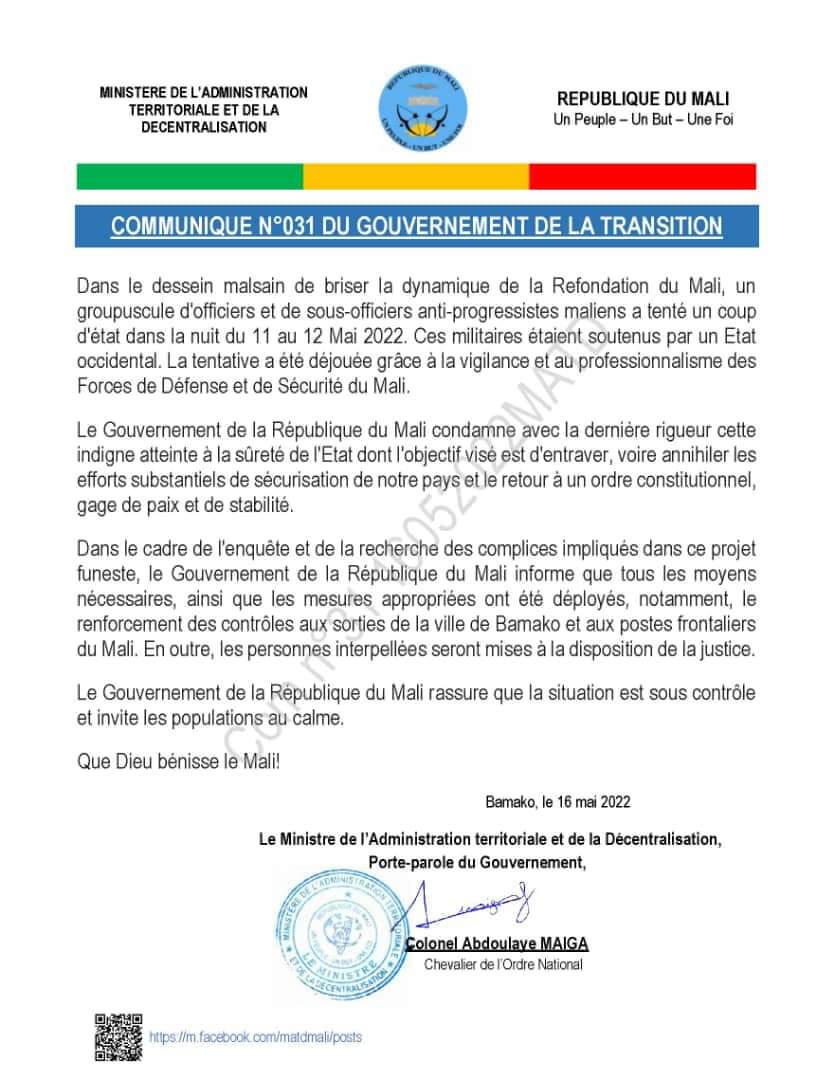 Un coup d’Etat militaire a été déjoué à Bamako dans la nuit du 11 au 12 mai 2022. Mais c’est ce lundi que le gouvernement a rendu publique la nouvelle. Selon le communiqué qui en fait cas, dont Laguinee.info détient copie, les auteurs sont un groupe d’officiers et de sous-officiers. Le même communiqué ajoute que ces individus auraient bénéficié du soutien d’un « Etat occidental ».