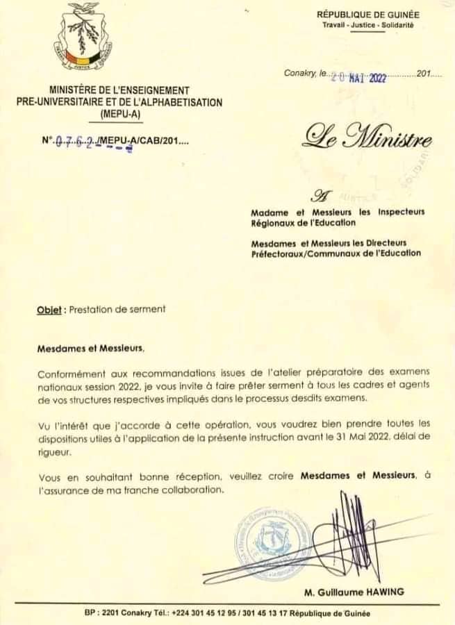 A travers une note de service en date de ce vendredi 20 mai 2022 dont Laguinee.info détient copie, le ministre de l’enseignement pré-universitaire et de l’alphabétisation a instruit aux inspecteurs régionaux, aux directeurs préfectoraux et aux directeurs communaux de l’éducation de faire prêter serment à tous les cadres et agents de leurs structures respectives impliqués dans le processus de l’organisation des examens nationaux session 2022. Ce, conformément aux recommandations issues de l’atelier préparatoire desdits examens.