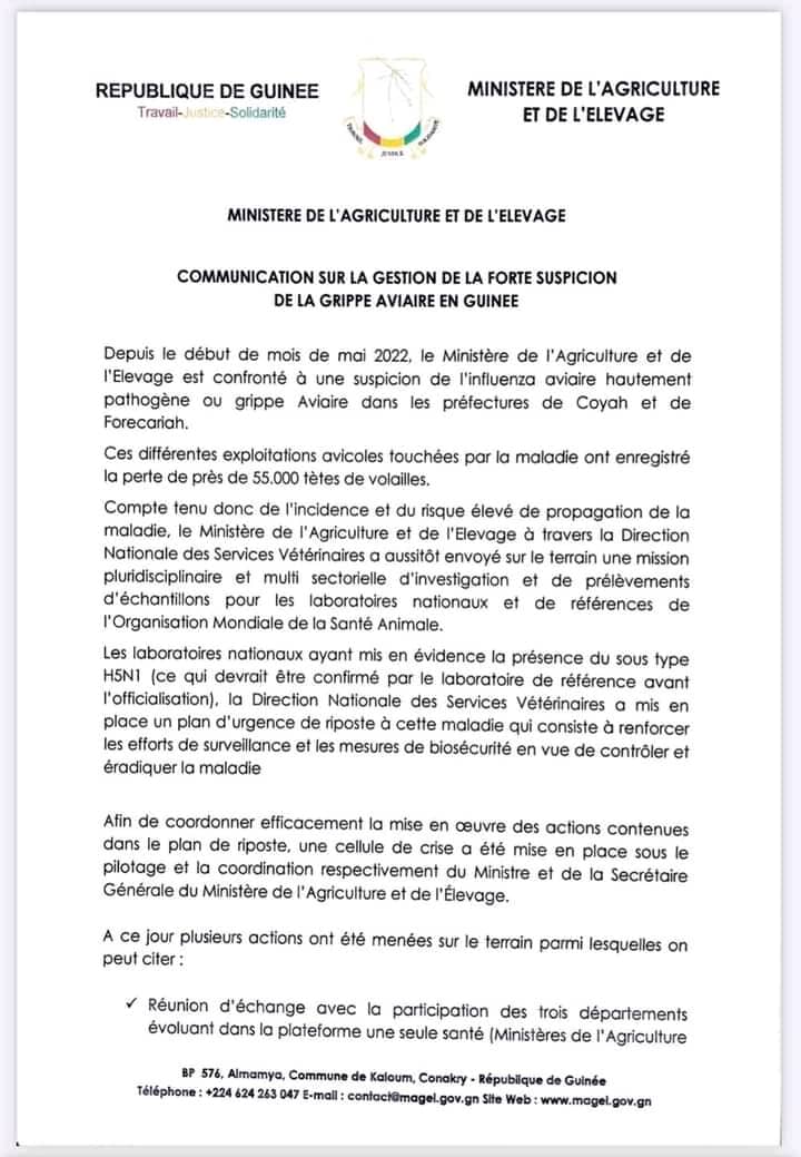Dans une communication rendue publique ce lundi 23 mai 2022 dont Laguinee.info détient copie, le ministère de l’agriculture et de l’élevage dit être confronté à une suspicion de l’influenza aviaire hautement pathogène ou grippe Aviaire dans les préfectures de Coyah et de Forecariah. Ces différentes exploitations avicoles touchées par la maladie ont enregistré la perte de près de 55.000 tètes de volailles.