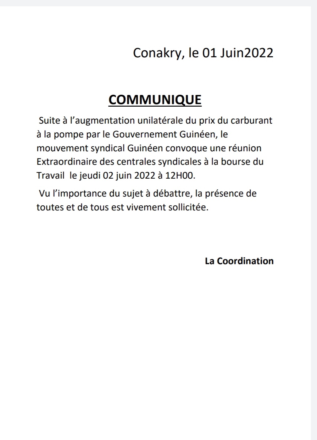 Dans un communiqué dont copie a été transmise à la rédaction de Laguinee.info, le mouvement syndical guinéen annonce la ténue d’une réunion extraordinaire des centrale syndicales à la bourse du travail ce jeudi, 02 juin 2022. Cette réunion, indique le communiqué, fait suite à l’augmentation « unilatérale » du prix du carburant à la pompe par le Gouvernement.