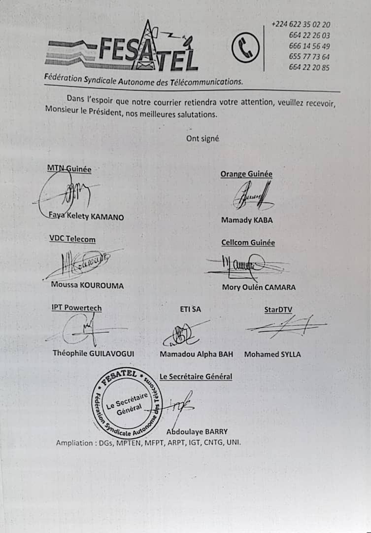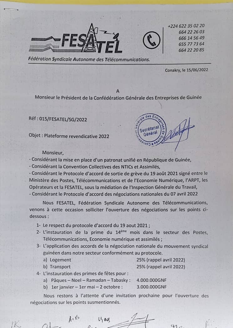 Dans un courrier en date de ce jeudi, 16 juin 2022 dont Laguinee.info détient copie, la Fédération Syndicale Autonome des Télécommunications (FESATEL) réclame le respect des accords avec la Confédération générale des entreprises de la Guinée. Dans ledit courrier, la FESATEL exige le respect du protocole d’accord du 19 août 2021.