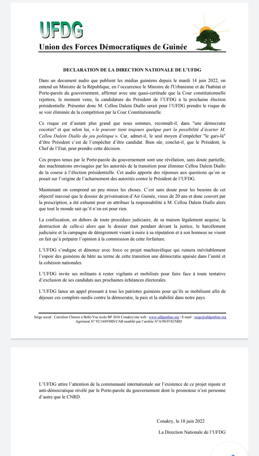 Laguinee.info vous propose ci-dessous la copie de cette déclaration