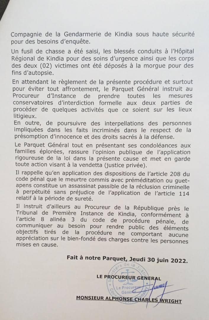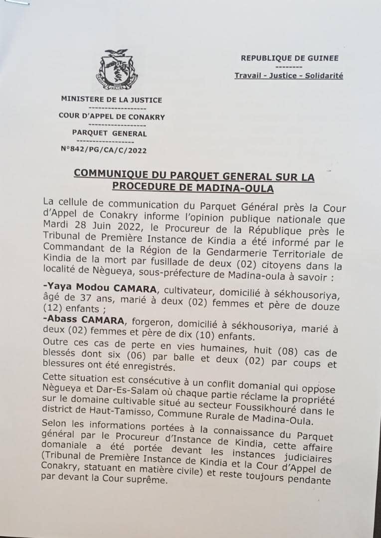 Le Parquet général de la Cour d’appel de Conakry a fait une communication ce jeudi 30 juin 2022, sur le fusillade qui a coûté la vie à deux personnes à Nègueya, sous-préfecture de Madina-Oula suite à un conflit domanial.