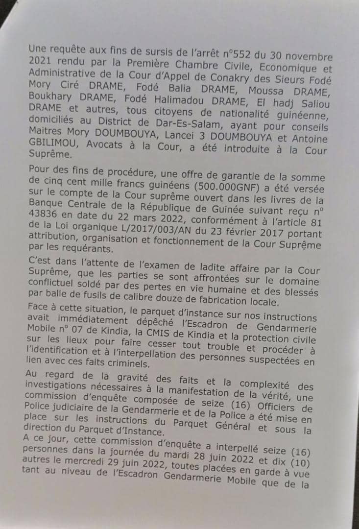 Dans le communiqué rendu public dont Laguinee.info détient copie, le Parquet Général a informé que la commission d’enquête mise sur place après les événements a interpellé seize (16) personnes dans la journée du mardi 28 juin 2022 et dix (10) autres le mercredi 29 juin 2022, toutes placées en garde à vue tant au niveau de l’Escadron Gendarmerie Mobile que de la Compagnie de la Gendarmerie de Kindia sous haute sécurité pour des besoins d’enquête.