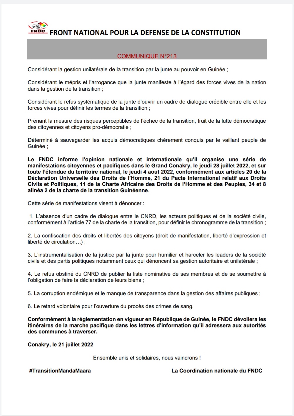 Dans une déclaration rendue publique ce jeudi 21 juillet 2022 à Conakry et dont Laguinee.info détient copie, le Front National pour la Défense de la Constitution (FNDC) a informé l’opinion nationale et internationale qu’il organise une série de manifestations.