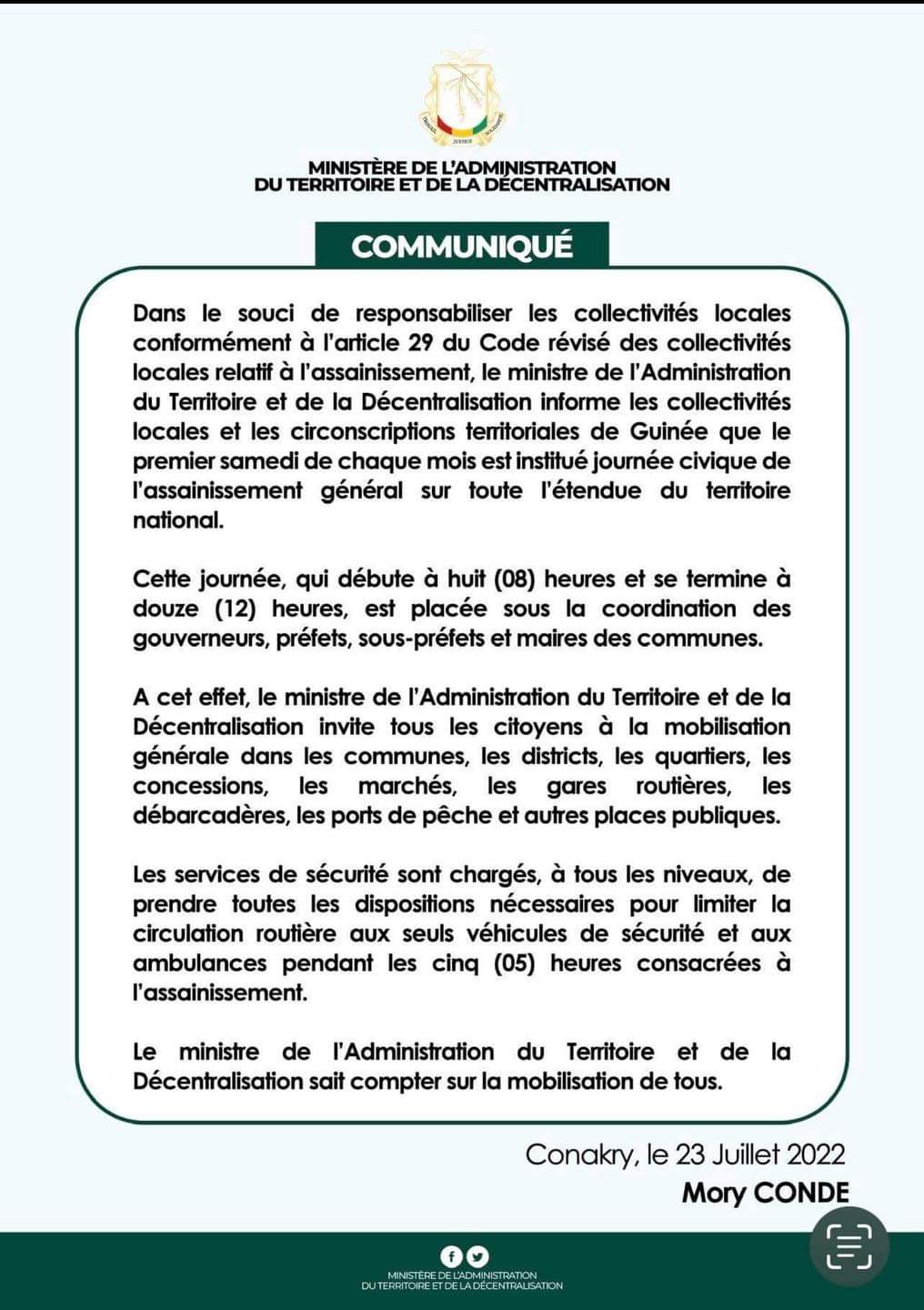 Dans un communiqué rendu public ce samedi 23 juillet 2022 dont Laguinee.info détient copie, Mory Condé, ministre de l’Administration du Territoire et de la Décentralisation, a informé l’institution d’une journée civique de l’assainissement général sur toute l’étendue du territoire national. Contrairement au régime déchu, le CNRD prévoit le premier samedi de chaque mois.