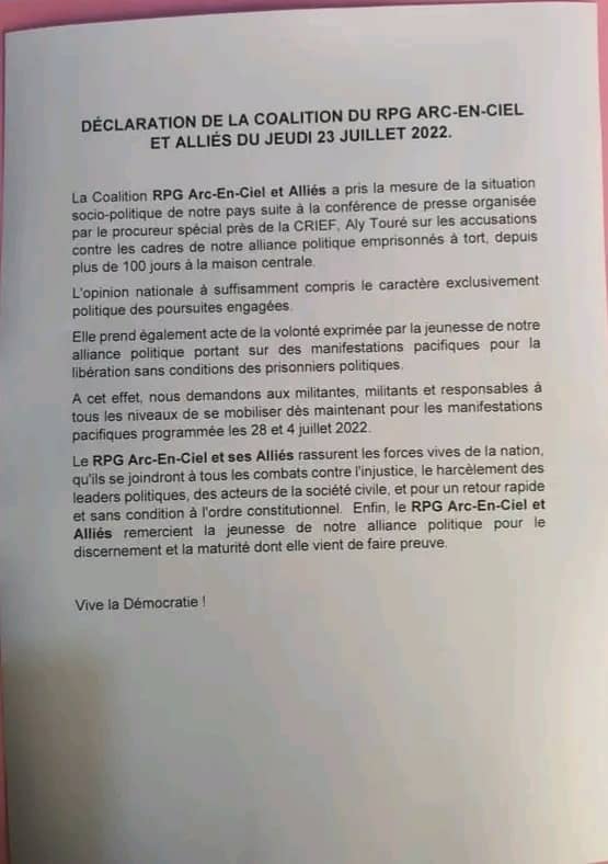 A cet effet, le RPG Arc-En-Ciel demande aux militantes, militants et responsables à tous les niveaux de se mobiliser dès maintenant pour les manifestations pacifiques programmées les 28 juillet et 4 août 2022.