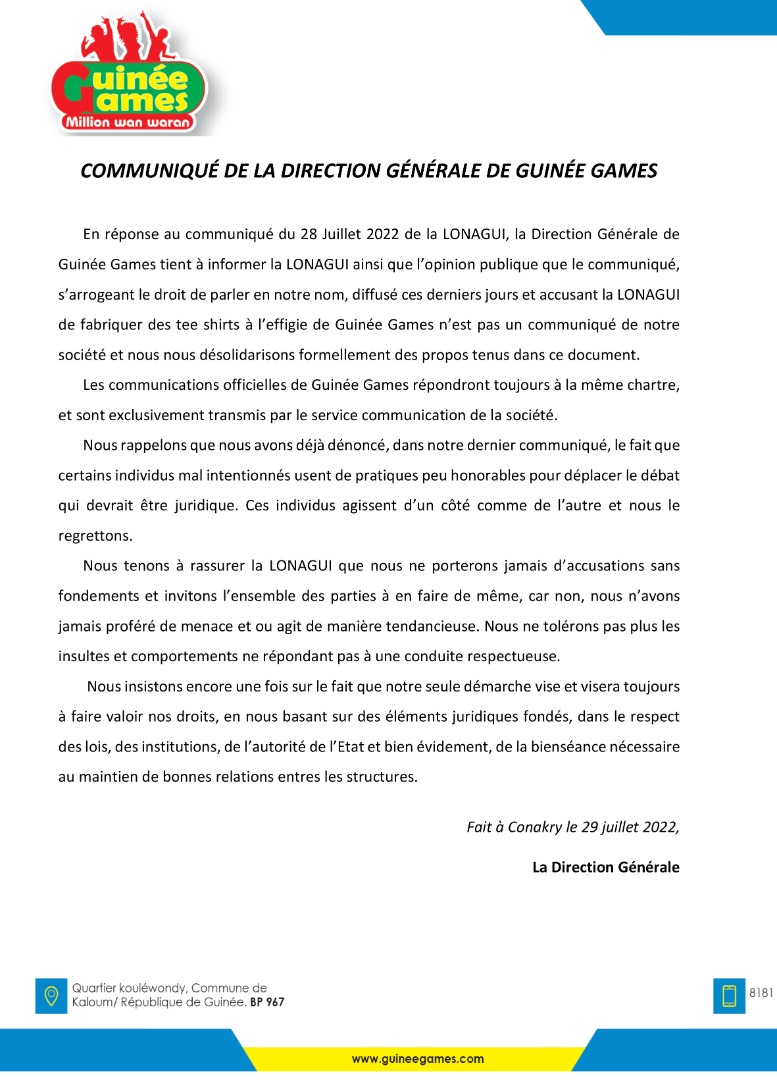 La Direction de la Société Guinée Games apporte un démenti formel au communiqué selon lequel, elle serait à l’origine des accusations à l’encontre de la LONAGUI sur une prétendue confection des T-shirt à l’effigie de Guinee Games.