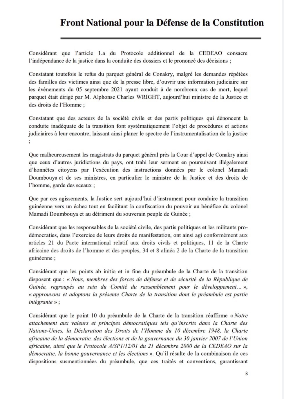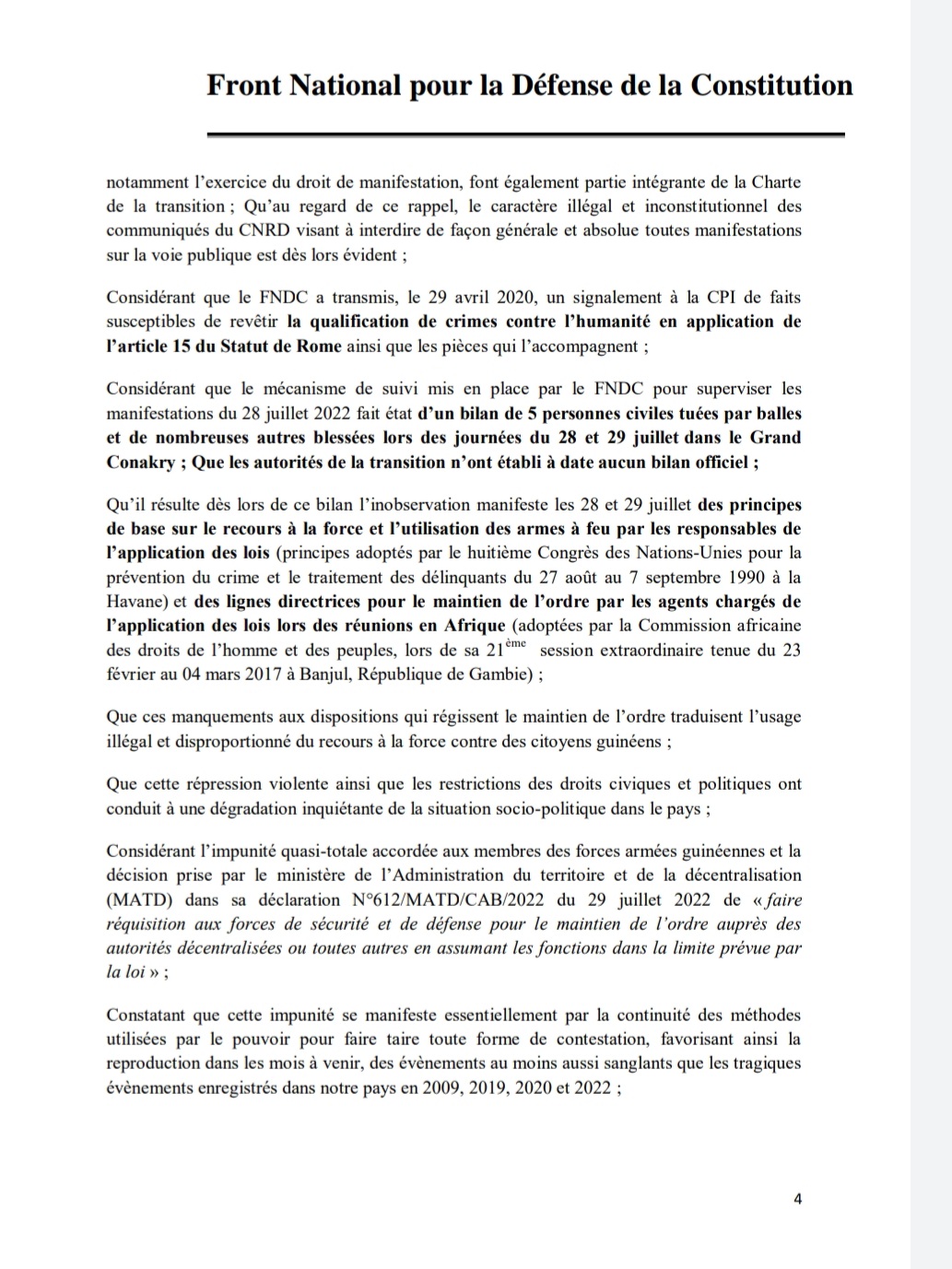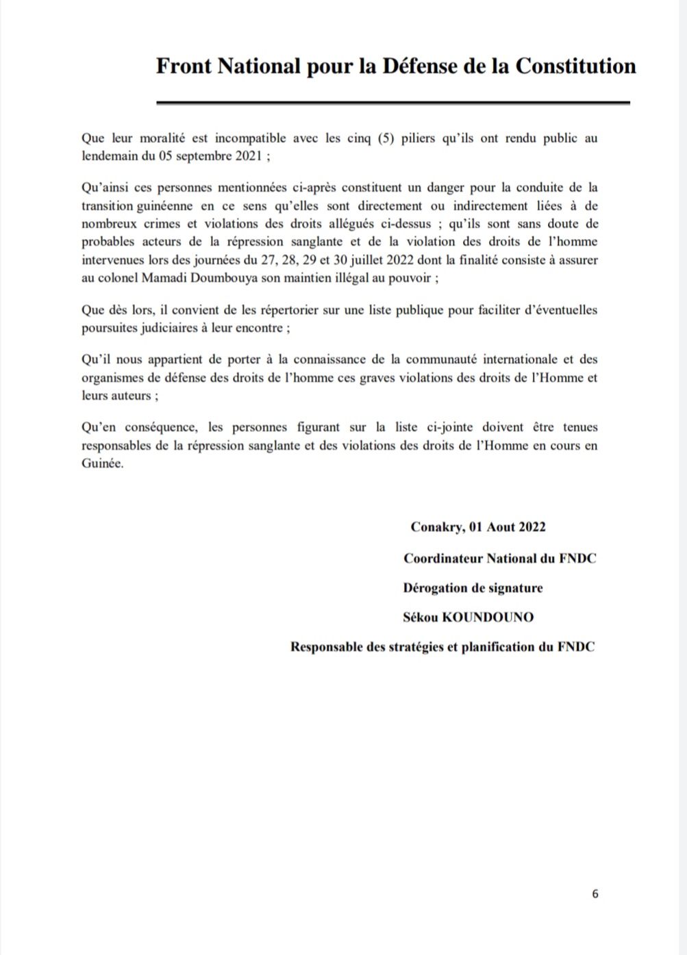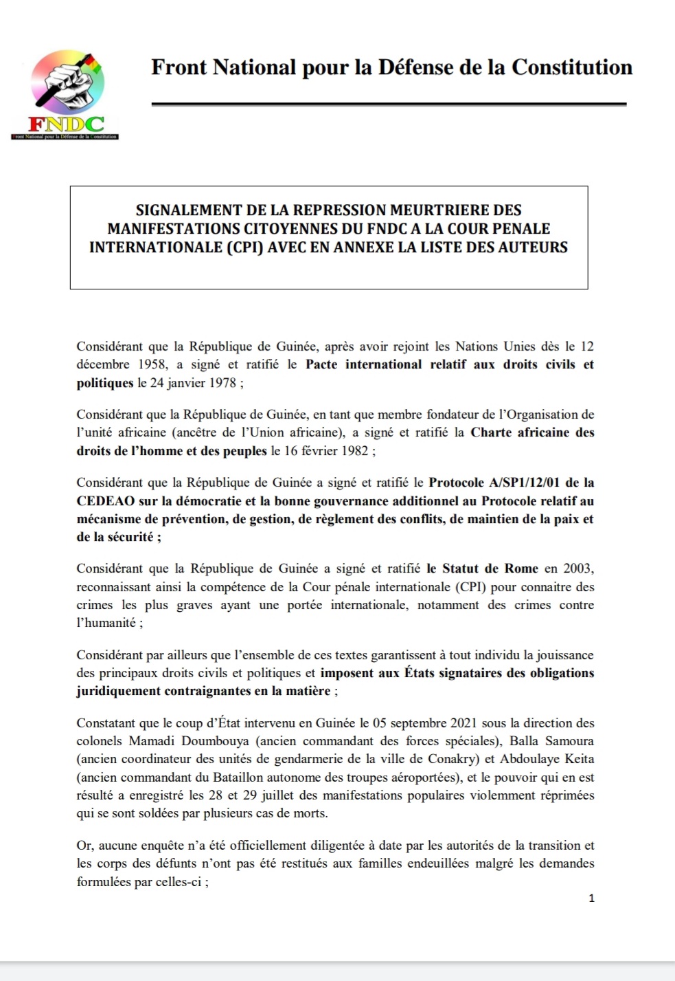 A travers une note en date du 1er août 2022 dont Laguinee.info détient copie, le Front National pour la Défense de la Constitution (FNDC) dit avoir transmis un signalement de la répression meurtrière des manifestations citoyennes du mouvement à la Cour Pénale Internationale (CPI) avec en annexe la liste des 13 auteurs dont le Colonel Mamadi Doumbouya, le Président de la transition.