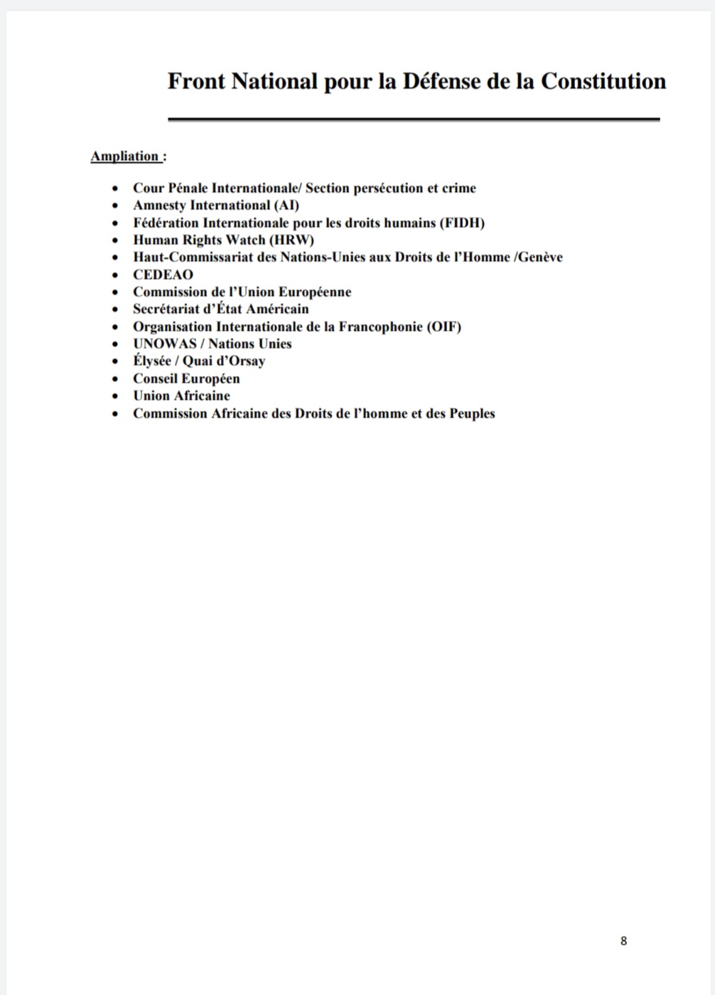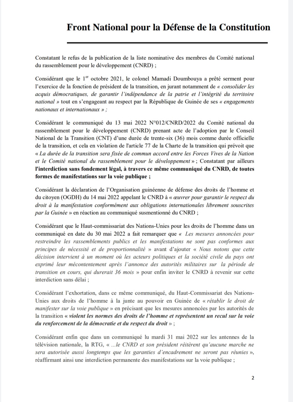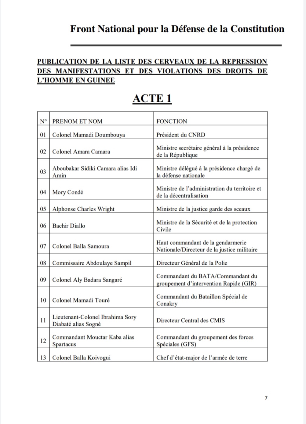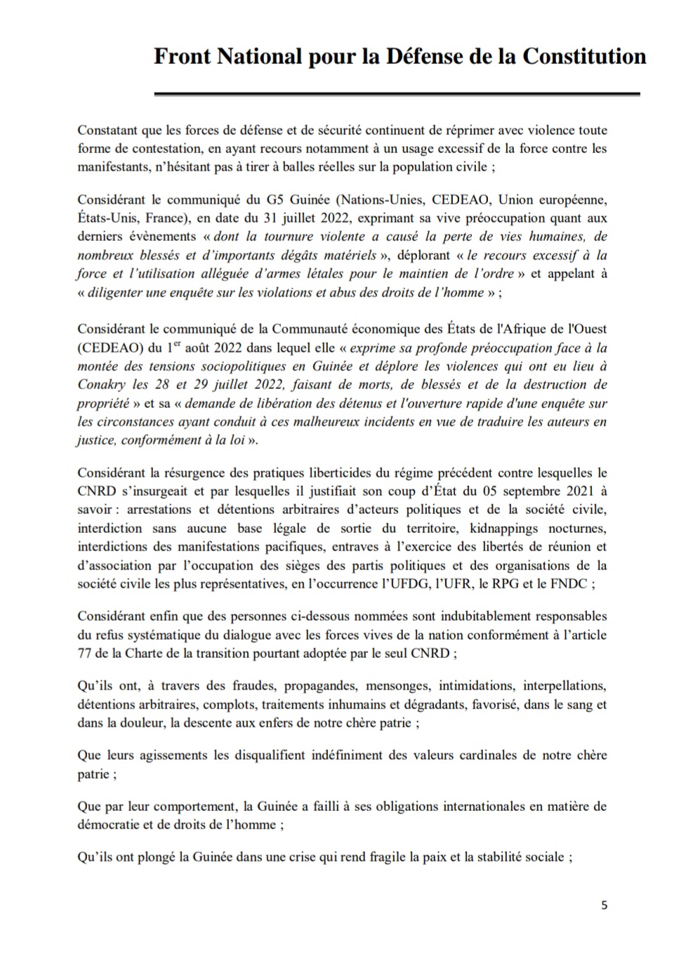 A travers une note en date du 1er août 2022 dont Laguinee.info détient copie, le Front National pour la Défense de la Constitution (FNDC) dit avoir transmis un signalement de la répression meurtrière des manifestations citoyennes du mouvement à la Cour Pénale Internationale (CPI) avec en annexe la liste des 13 auteurs dont le Colonel Mamadi Doumbouya, le Président de la transition.