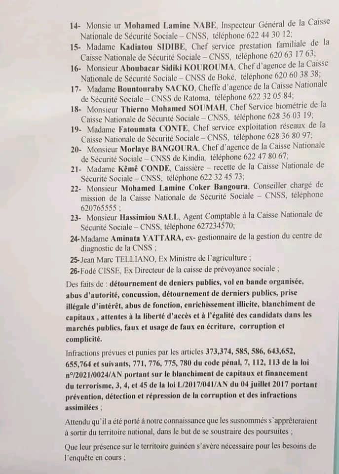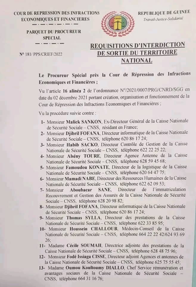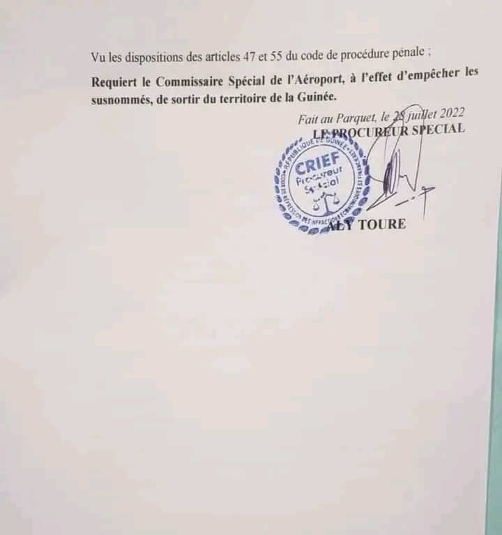 A travers une note en date du 28 juillet 2022 dont Laguinee.info détient copie, le procureur spécial près la CRIEF a requis le Commissaire Spécial de l’Aéroport, à l’effet d’empêcher ces personnes de sortir du territoire de la Guinée.