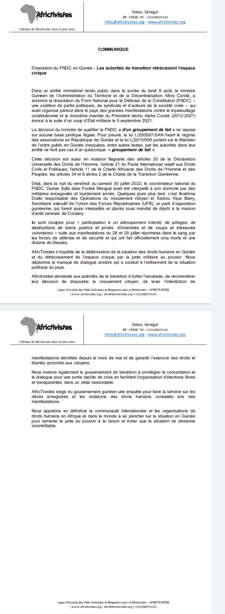 Par ailleurs, AfricTivistes se dit inquiète de la détérioration de la situation des droits humains en Guinée et du rétrécissement de l’espace civique par la junte militaire au pouvoir.