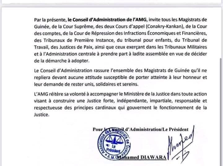 Au cours d’une réunion d’urgence, ce mardi 16 août 2022, le Conseil d’Administration de l’AMG a décidé à l’unanimité avec la présence de cinq membres sur sept (les deux absents ayant également manifesté leur avis favorable à travers la plateforme de communication du CA), de convoquer une Assemblée générale extraordinaire ce vendredi 19 août 2022, à 10 heures précises, dans la salle d’audience de la Cour d’Appel de Conakry.