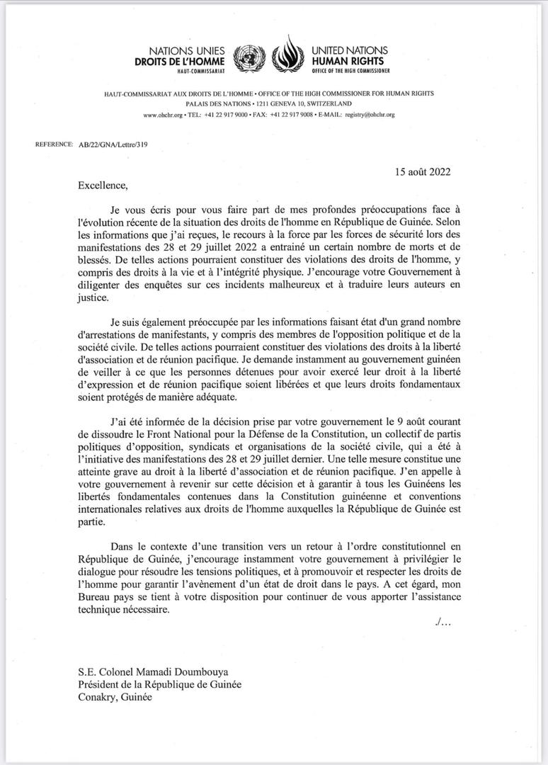 Dans une lettre adressée au Président de la Transition, le Colonel Mamadi Doumbouya le 15 août 2022, dont la rédaction de Laguinee.info détient copie, le Haut-commissariat des Nations-Unies aux Droit de l’Homme, a fait part de ses préoccupations au Gouvernement face à la situation des Droits de l’Homme en Guinée.