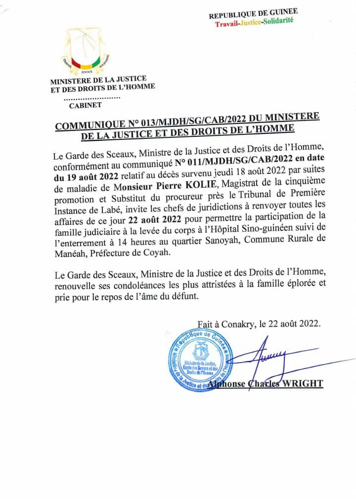 Conformément au communiqué N° 011/MJDH/SG/CAB/2022 en date du 19 août 2022 relatif au décès survenu jeudi 18 août 2022 par suites de maladie de Monsieur Pierre KOLIE, Magistrat de la cinquième promotion et Substitut du procureur près le Tribunal de Première Instance de Labé, le ministre de la justice Alphonse Charles Wright a invité les chefs de juridictions à renvoyer toutes les affaires de ce jour 22 août 2022 pour permettre la participation de la famille judiciaire à la levée du corps à l’Hôpital Sino-guinéen suivi de l’enterrement à 14 heures au quartier Sanoyah, commune rurale de Maneah, préfecture de Coyah.