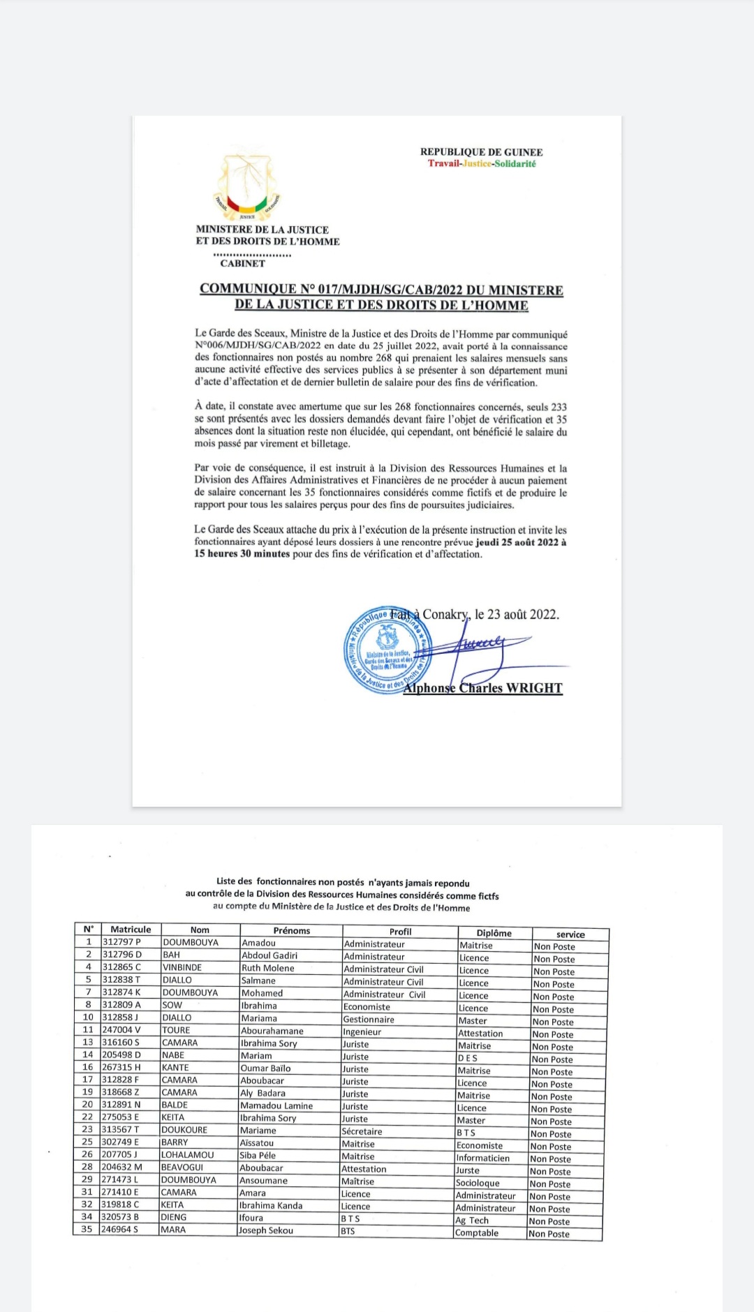 Ce lundi 23 août 2022, le ministre Alphonse Charles Wright a sorti un nouveau communiqué dont un journaliste de Laguinee.info consulté, dans lequel, il dit constater « avec amertume que sur les 268 fonctionnaires concernés, seuls 233 se sont présentés ». Cependant les 35 absents que le ministre qualifie de « fictifs », ont reçu le salaire du mois passé. Ainsi le Garde des Sceaux compte engager des poursuites judiciaires contre eux.