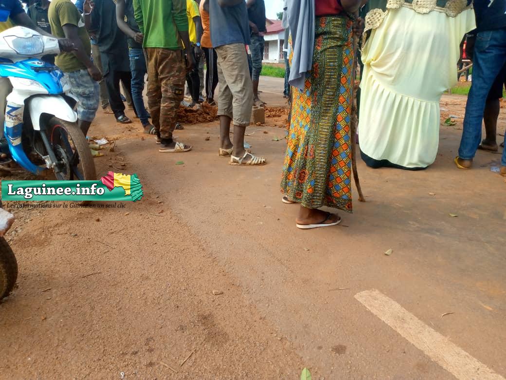 Ce vendredi matin, jour du marché hebdomadaire de la sous-préfecture de Kintinian, la route a été complètement barricadée par des cailloux , des troncs d’arbres et autres objets par des jeunes manifestants.