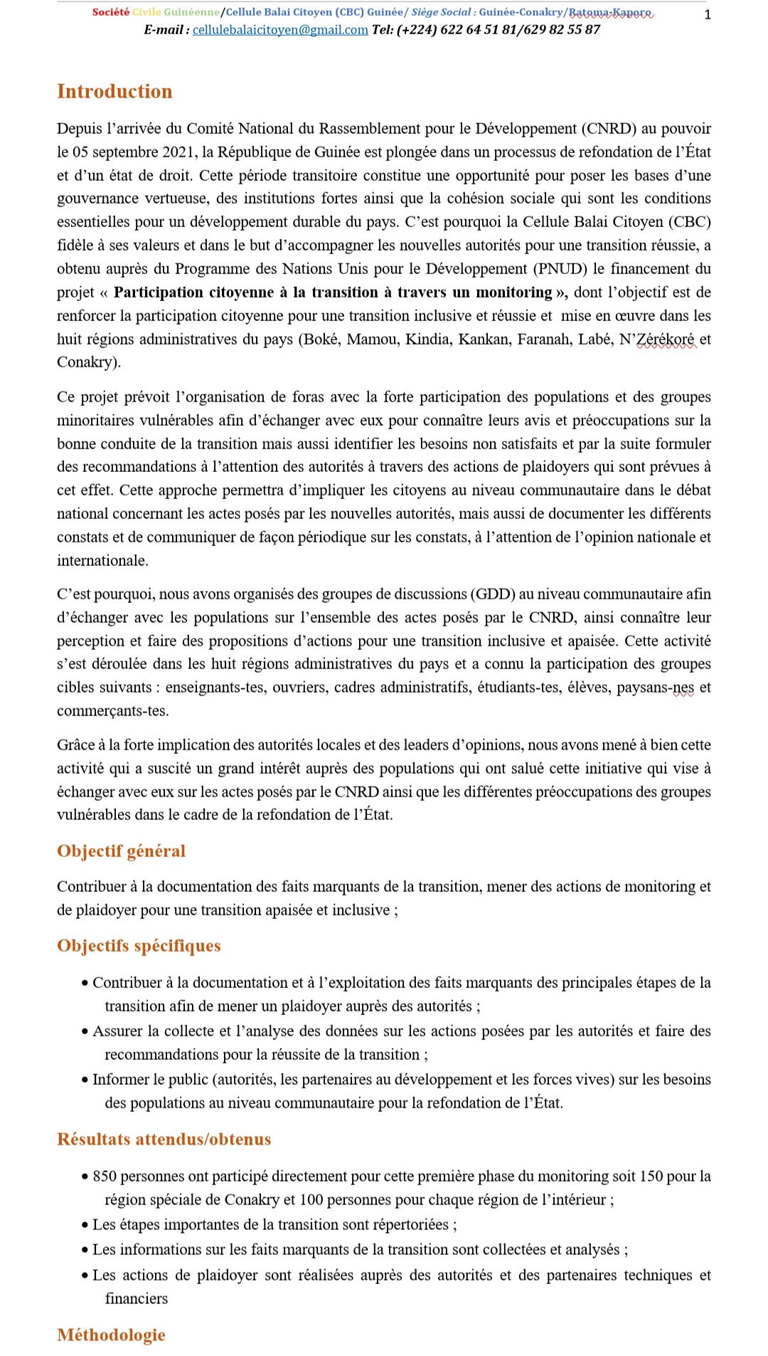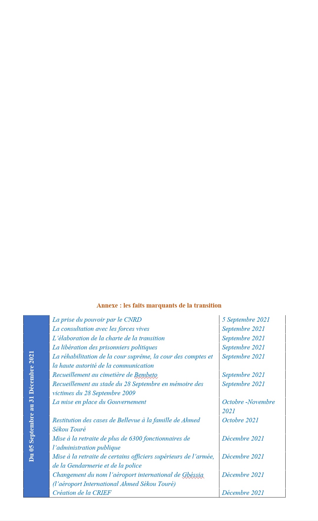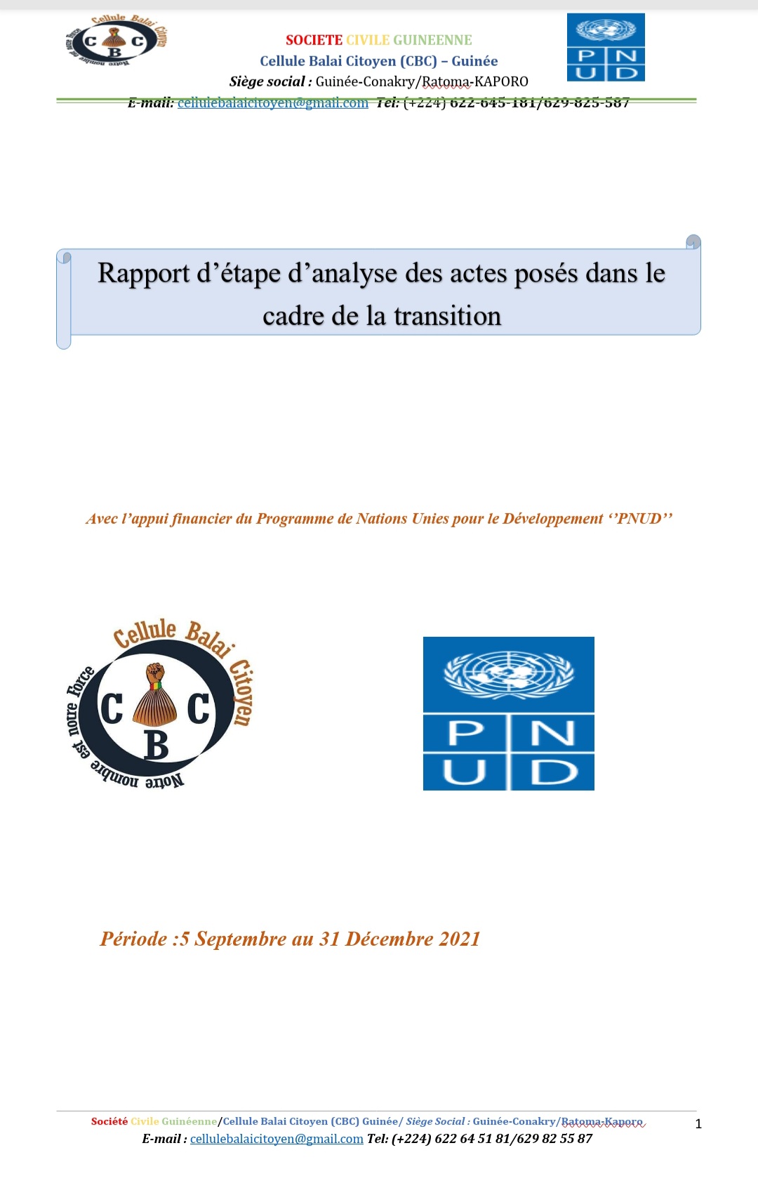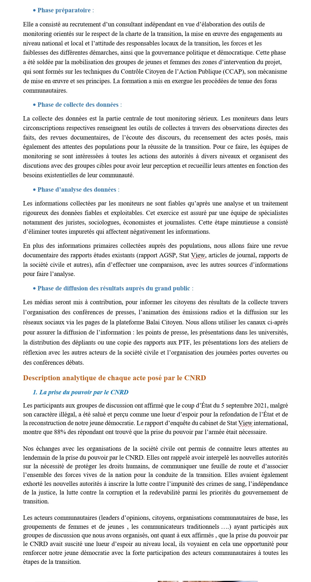 A cette occasion, un rapport d’étape d’analyse des actes posés dans le cadre de la transition par le CNRD a été présenté. Ce premier rapport concerne la période allant du 05 septembre 2021, date de la prise du pouvoir par le CNRD à la date du 31 décembre 2021.