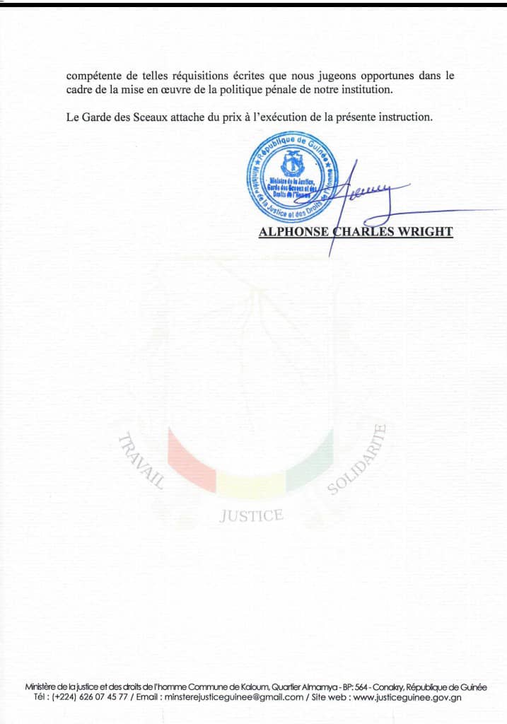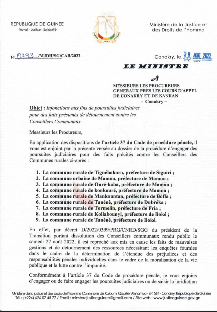 A travers une note en date de ce lundi 29 août 2022 dont Laguinee.info détient copie, le ministre de la justice Alphonse Charles Wright a fait des injonctions aux fins de poursuites judiciaires pour des faits présumés de détournement contre les Conseillers Communaux des neuf Conseils communaux dissous récemment par le Président de la transition pour mauvaise gestion.