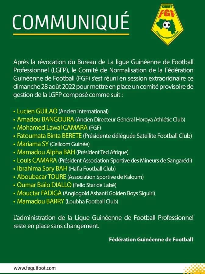 Après la révocation du Bureau de La Ligue Guinéenne de Football Professionnel (LGFP), le Comité de Normalisation de la Fédération Guinéenne de Football (FGF) s’est réuni en session extraoridnaire ce dimanche 28 août 2022 pour mettre en place un comité provisoire de gestion de la LGFP.