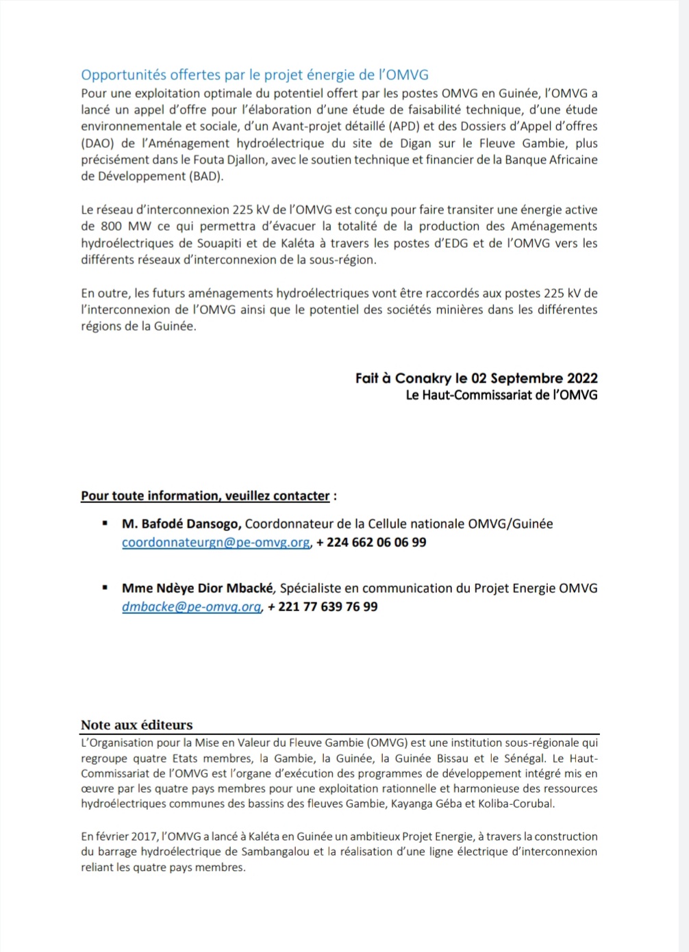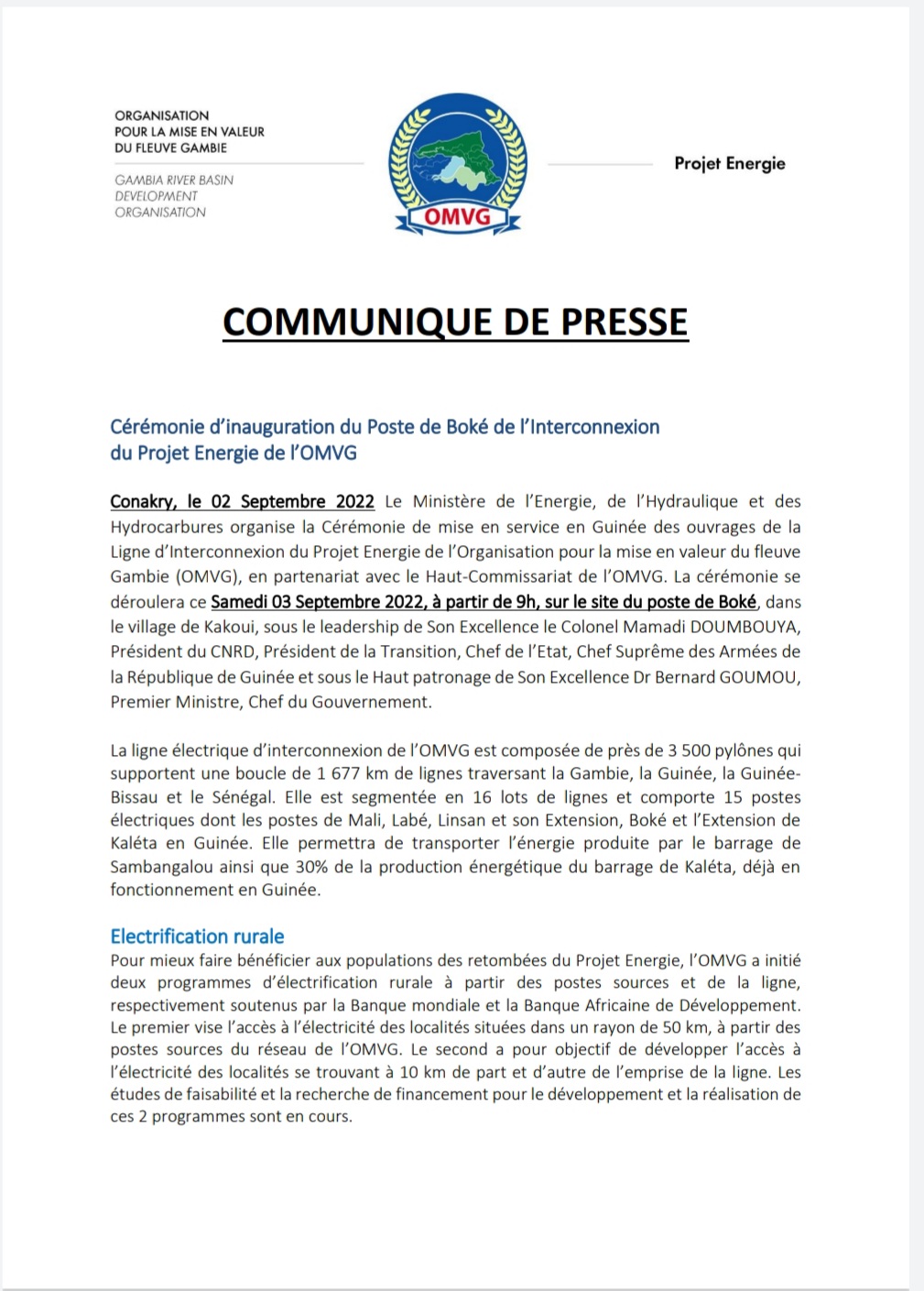 A travers un communiqué de presse en date de ce vendredi 02 septembre 2022 dont Laguinee.info détient copie, l’OMVG informe que le Ministère de l’Energie, de l’Hydraulique et des Hydrocarbures organise la Cérémonie de mise en service en Guinée des ouvrages de la Ligne d’Interconnexion du Projet Energie de l’Organisation pour la Mise en Valeur du fleuve Gambie (OMVG), en partenariat avec le Haut-Commissariat de l’OMVG.