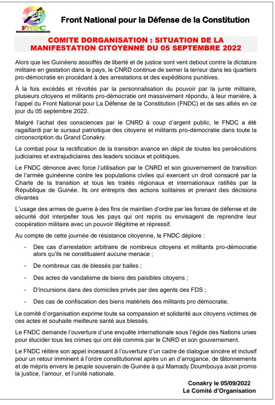 A travers un communiqué en date du 05 septembre 2022 dont Laguinee.info détient copie, le FNDC a dressé le bilan de sa manifestation.