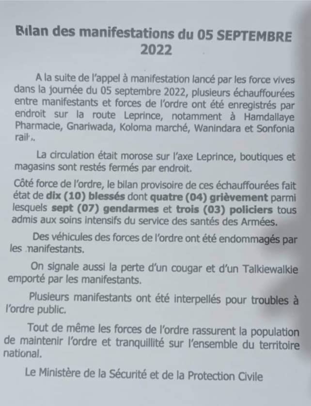 A travers une note publiée ce lundi 05 septembre 2022 dont Laguinee.info détient copie, la police nationale a fait le bilan de la manifestation de la journée appelée par le FNDC.