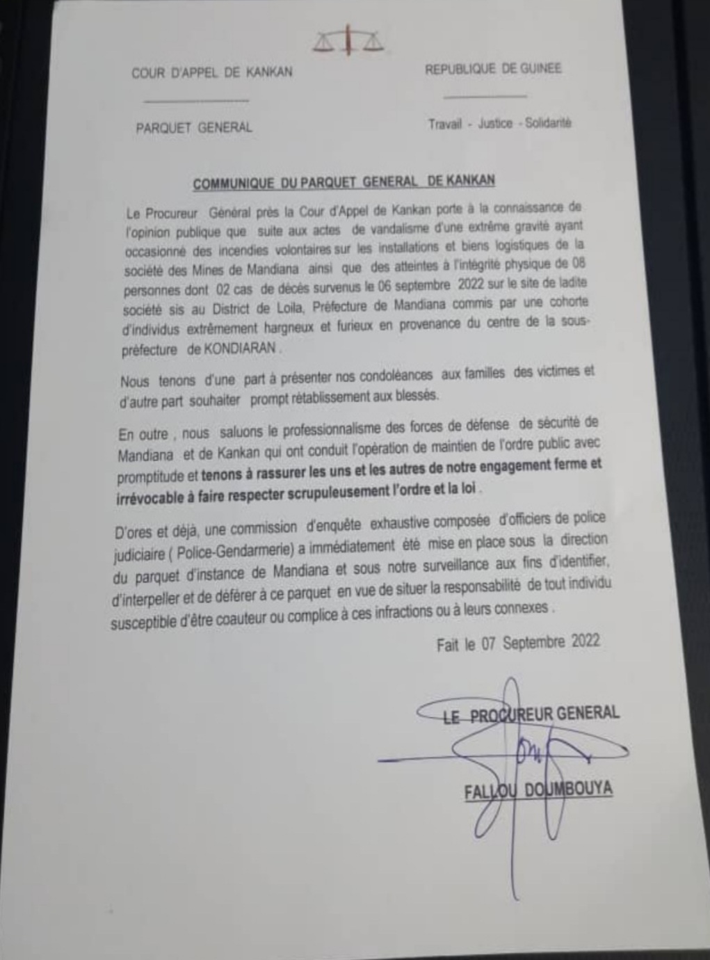 A la suite de ce vandalisme d’une extrême gravité, une commission d’enquête exhaustive composée d’officiers de police judiciaire (Police-Gendarmerie) a immédiatement été mise en place sous la direction du parquet d’instance de Mandiana et sous notre surveillance aux fins d’identifier, d’interpeller et de déférer à ce parquet en vue de situer la responsabilité de tout individu susceptible d’être coauteur ou complice à ces infractions ou à leurs connexes, informe Fallou Doumbouya, procureur de général près la Cour d’appel de Kankan.