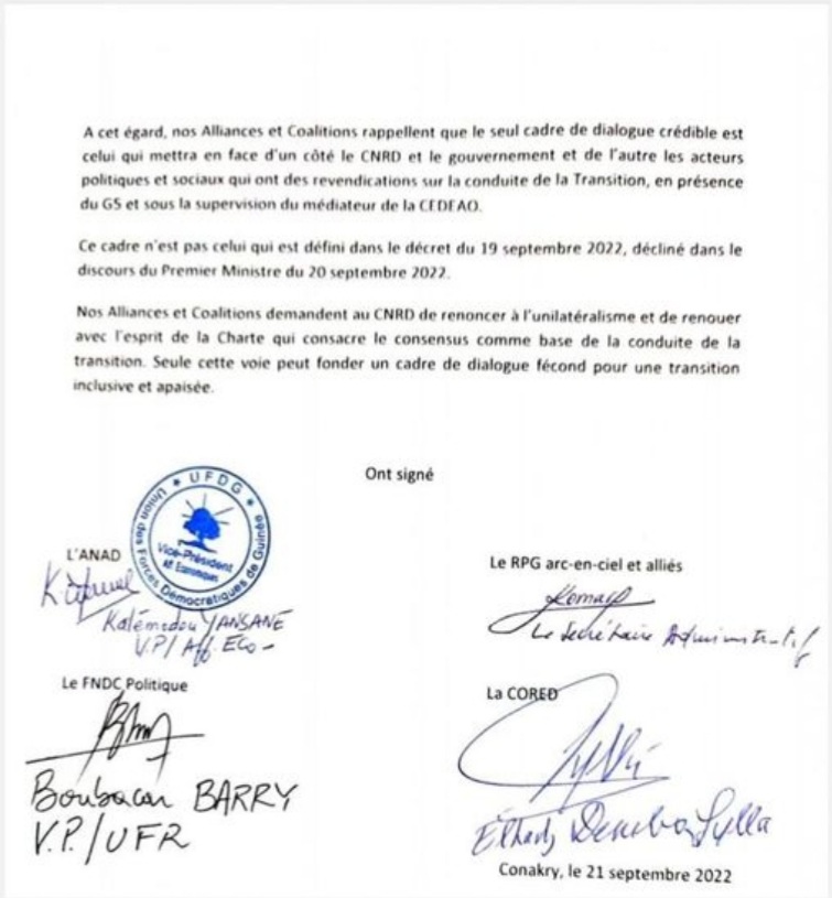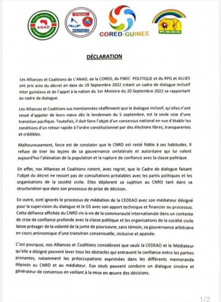A travers une déclaration commune rendue publique ce mercredi 21 septembre 2022 dont Laguinee.info détient copie, les coalitions politiques ANAD, RPG arc-en-ciel, CORED et FNDC Politique disent noter avec regret, que le Cadre de dialogue faisant l’objet du décret ne ressort pas de consultations préalables avec les partis politiques et les organisations de la société civile. Elles déplorent sa sujétion au CNRD tant dans sa structuration que dans son processus de prise de décision.