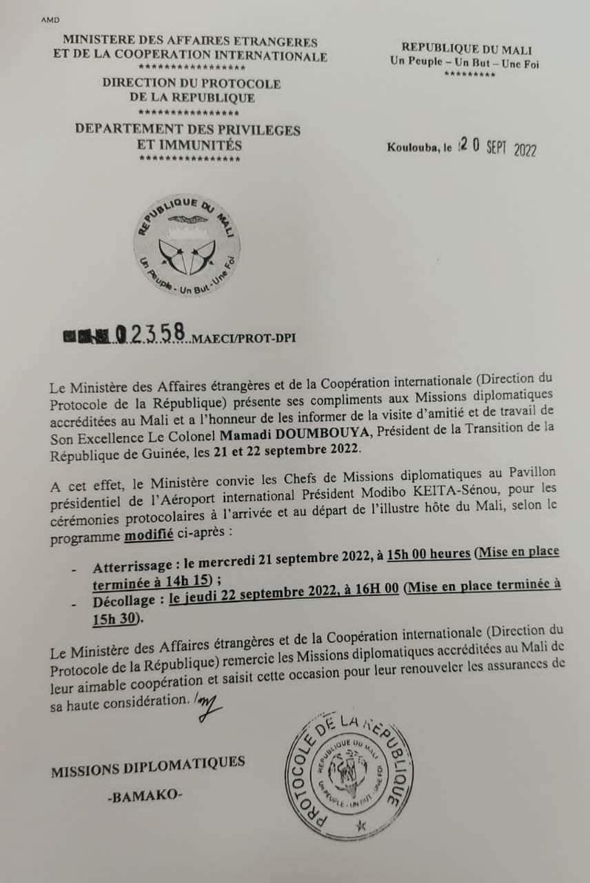 Dans une note du ministère des affaires étrangères du Mali dont Laguinee.info détient copie, les chefs de missions diplomatiques accréditées auprès du pays ont été informés de l’arrivée du chef de la junte guinéenne pour une visite d’amitié et de travail.