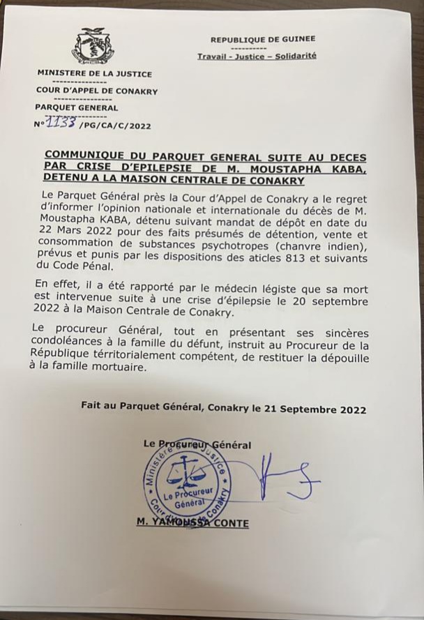 Laguinee.info vous propose ci-dessous le communiqué relatif au décès de ce détenu
