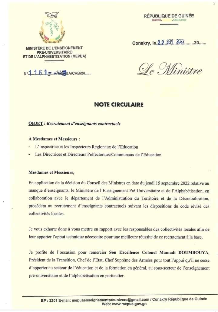 En application de la décision du Conseil des Ministres en date du jeudi 15 septembre 2022 relative au manque d’enseignants, le Ministère de l’Enseignement Pré-Universitaire et de l’Alphabétisation, en collaboration avec le département de l’Administration du Territoire et de la Décentralisation, procèdera au recrutement d’enseignants contractuels suivant les dispositions du code révisé des collectivités locales.