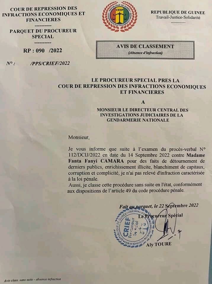 A travers une note en date du 22 septembre 2022 dont Laguinee.info détient copie, le procureur spécial près la CRIEF a informé que suite à l’examen du procès-verbal N° 112/DCIJ/2022 en date du 14 Septembre 2022 contre Madame Fanta Fanyi CAMARA pour des faits de détournement de deniers publics, enrichissement illicite, blanchiment de capitaux, corruption et complicité, il n’a pas relevé d’infraction caractérisée à la loi pénale.