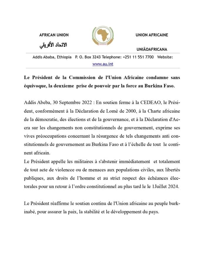 Dans un communiqué en date de ce 30 septembre 2022 dont Laguinee.info détient copie, l’Union Africaine à travers le président de la Commission se dit préoccupée et condamne sans équivoque, la deuxieme prise de pouvoir par la force au Burkina Faso.