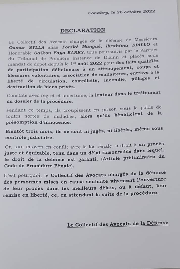 Laguinee.info vous propose c-dessous la déclaration du collectif des avocats de Foniké Menguè et cie