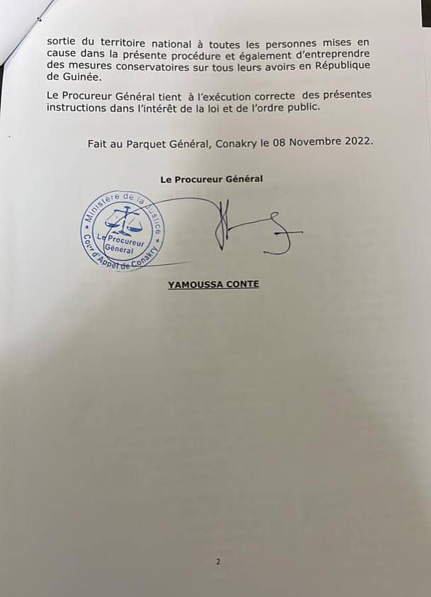 Dans un document consulté par un journaliste de Laguinee.info, le Procureur Général instruit le Procureur de la République près le TPI de Kaloum de procéder sans délai à l’interdiction de sortie du territoire d’Alpha Condé et 187 autres personnes. Cette décision vise également la saisine de leurs biens à titre conservatoire.