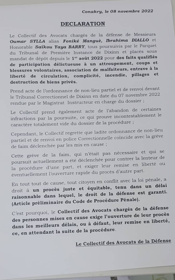 A travers une déclaration en date du 08 novembre 2022 dont Laguinee.info détient copie, le collectif des avocats de Foniké Menguè et de Ibrahima Diallo dit prendre acte de l’ordonnance de non-lieu partiel et de renvoi devant le Tribunal Correctionnel de Dixinn en date du 07 novembre 2022 rendue par le Magistrat Instructeur en charge du dossier.