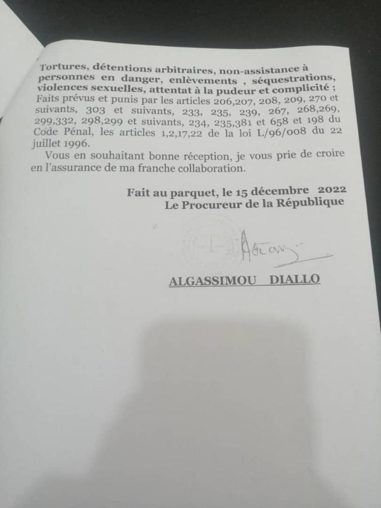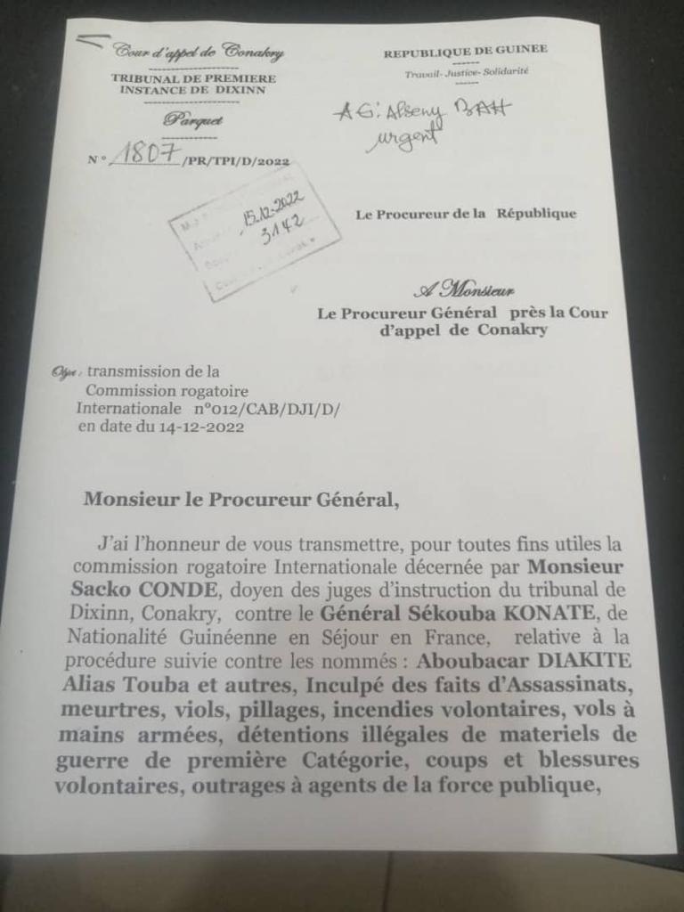 A travers une lettre reçue le 15 décembre dernier au Parquet Général dont Laguinee.info détient copie, le procureur de la République près le Tribunal de première instance de Dixinn a transmis au procureur général, une commission rogatoire internationale décernée par Monsieur Sacko CONDE, doyen des juges d’instruction du Tribunal de Dixinn contre le Général Sékouba KONATE, de nationalité Guinéenne en Séjour en France, relative à la procédure liée au massacre du 28 septembre 2009.