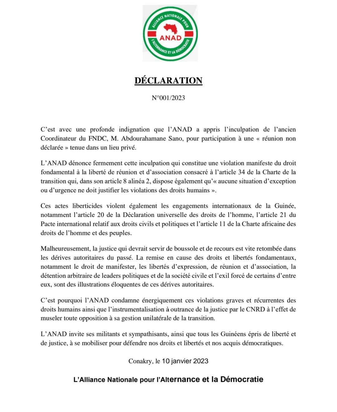 Dans une déclaration rendue publique ce mardi 10 janvier 2023 dont Laguinee.info détient copie, l’ANAD dit avoir appris avec une profonde indignation l’inculpation de l’ancien Coordinateur du FNDC, M. Abdourahamane Sano, pour participation à une « réunion non déclarée» tenue dans un lieu privé.