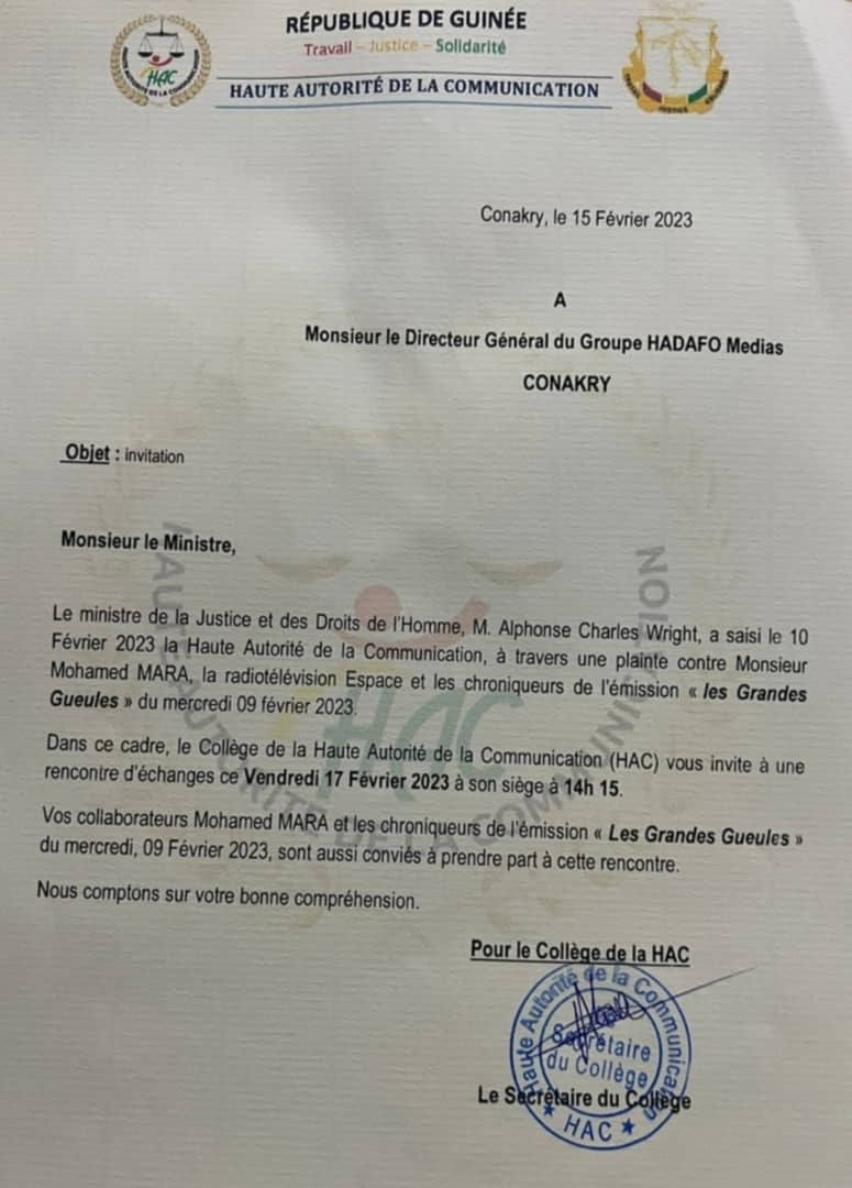 Dans une lettre en date du 15 février 2023 adressée au Directeur général du groupe Hadafo Médias dont Laguinee.info détient copie, la Haute Autorité de la Communication (HAC) a convié les chroniqueurs des Grandes Gueules à une rencontre ce vendredi, 17 février 2023 au siège de l’institution.