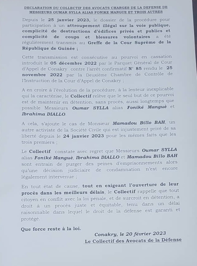 Dans une déclaration du collectif des avocats de Foniké Menguè et Cie, rendue publique ce lundi 20 février 2023, dont Laguinee.info détient copie, il dénonce la lenteur du traitement du pourvoi en cassation introduit par le parquet général contre l’arrêt confirmatif No 85 rendu le 25 novembre 2022 par la deuxième chambre de l’instruction de la cour d’appel de Conakry.