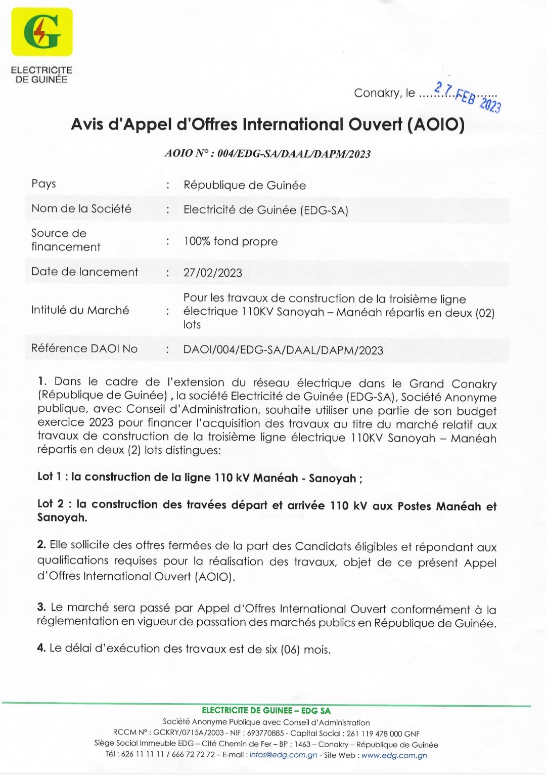 Dans le cadre de l’extension du réseau électrique dans le grand Conakry, l’Électricité de Guinée (EDG) lance un avis d’appel d’offres international ouvert pour les travaux de construction de la troisième ligne électrique 110KV Sanoyah-Manéah répartis en deux (02) lots : la construction de la ligne 110 kV Manéah-Sanoyah et la construction des travées départ et arrivée 110 kV aux Postes Manéah et Sanoyah.