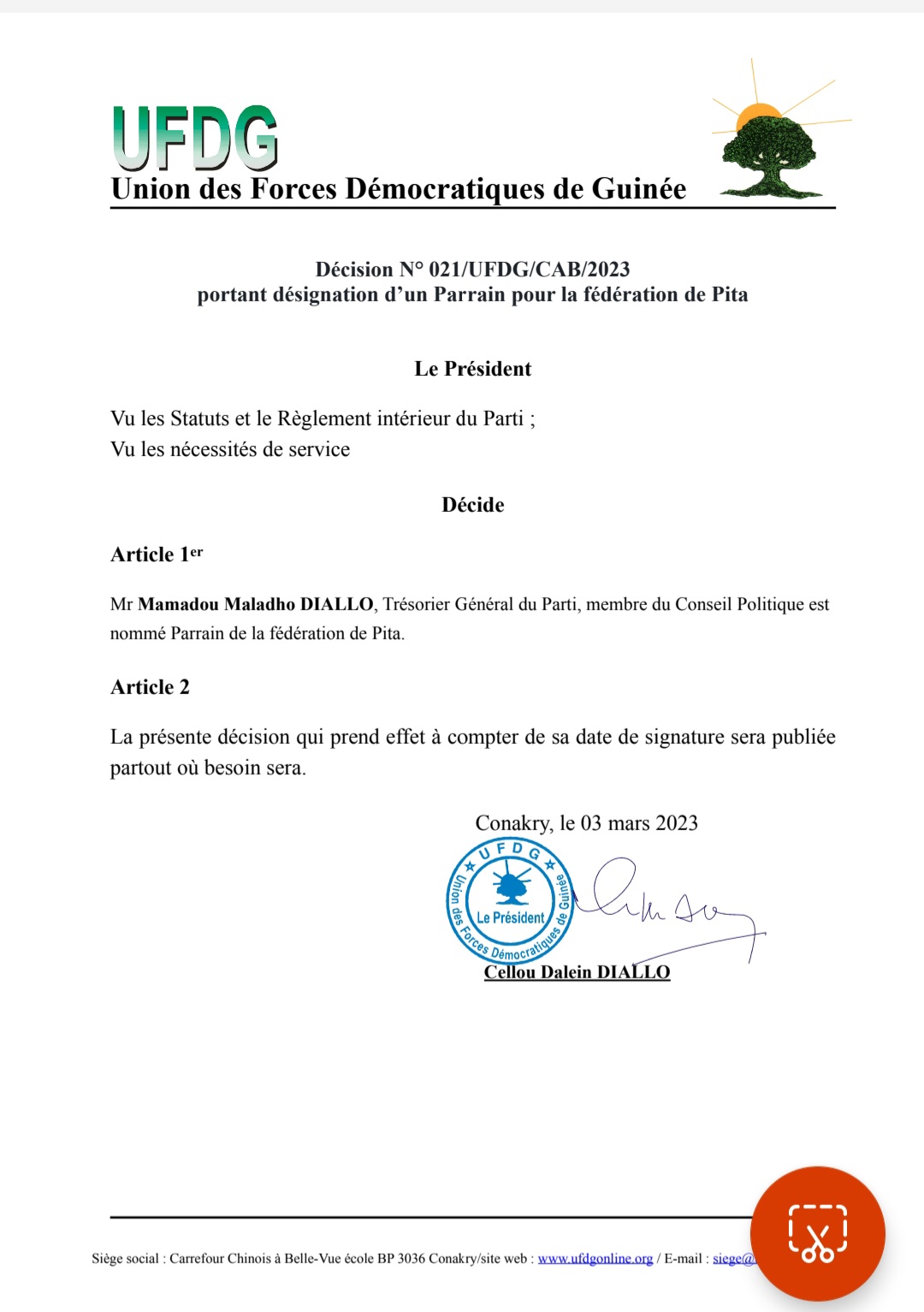À travers une décision prise ce vendredi 3 mars 2023, par Cellou Dalein Diallo président de l’Union des Forces Démocratiques de Guinée (UFDG), Mamadou Maladho Diallo trésorier général du Parti, a été nommé parrain de la fédération de Pita.