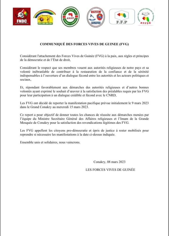 Suite à la médiation des religieux, les forces vives de Guinée décident de reporter leur manifestation au 15 mars prochain, initialement prévue pour demain 9 mars.