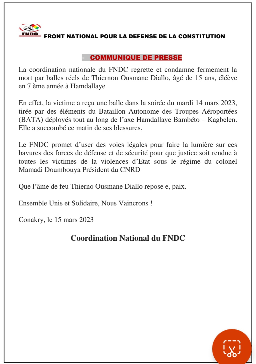 Le Front National pour la Défense de la Constitution (FNDC) a, dans un communiqué rendu public ce mercredi 15 mars 2023 dont Laguinee.info détient copie, condamné et regretté la mort de l’élève âgé seulement de 15 ans des suites de balles réelles du fait du BATA.