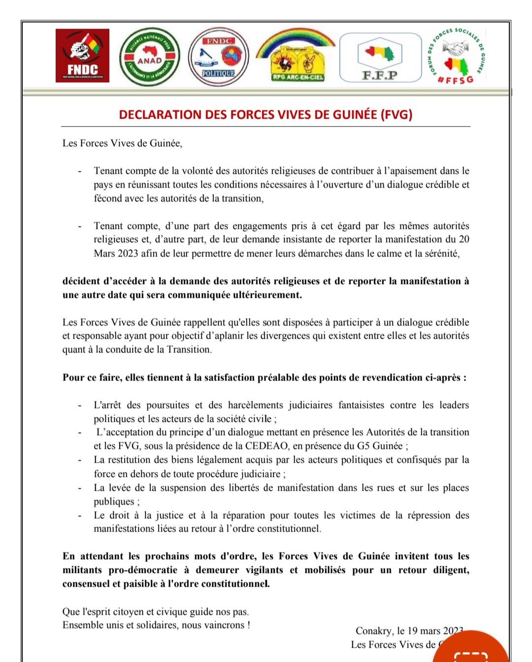 La marche des forces vives contre la junte militaire au pouvoir a été reportée à une autre date qui fera l’objet de communication. C’est la quintessence d’un communiqué des forces vives de Guinée dont Laguinee.info détient copie.