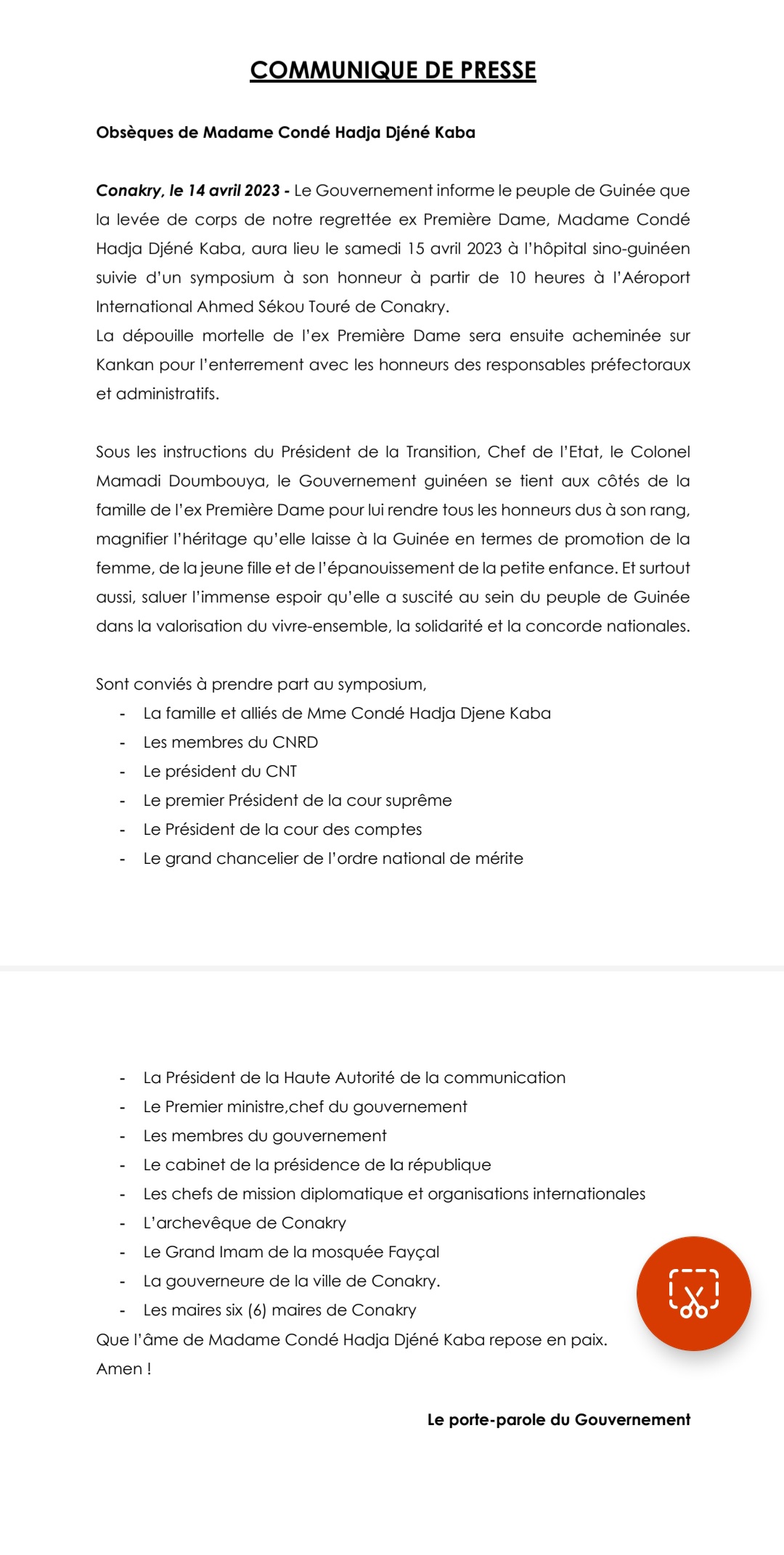 Dans ce même communiqué, on remarque que la présidence a, cette fois et contrairement au communiqué annonçant son décès, fait mention du nom de son mari Alpha Condé, allant jusqu’à l’appeler Mme Condé Hadja Djene Kaba.
